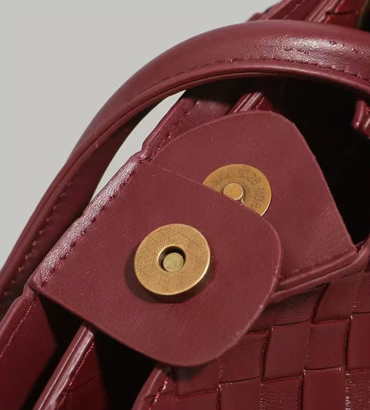 Vera är en stilren handväska i svart flätad PU-läder med en dekorativ gulddetalj framtill. Väskan mäter 35 × 14 × 24 cm. Den stängs med en praktisk magnetknapp och passar perfekt för både vardag och fest. En tidlös väska som kombinerar stil och funktion.